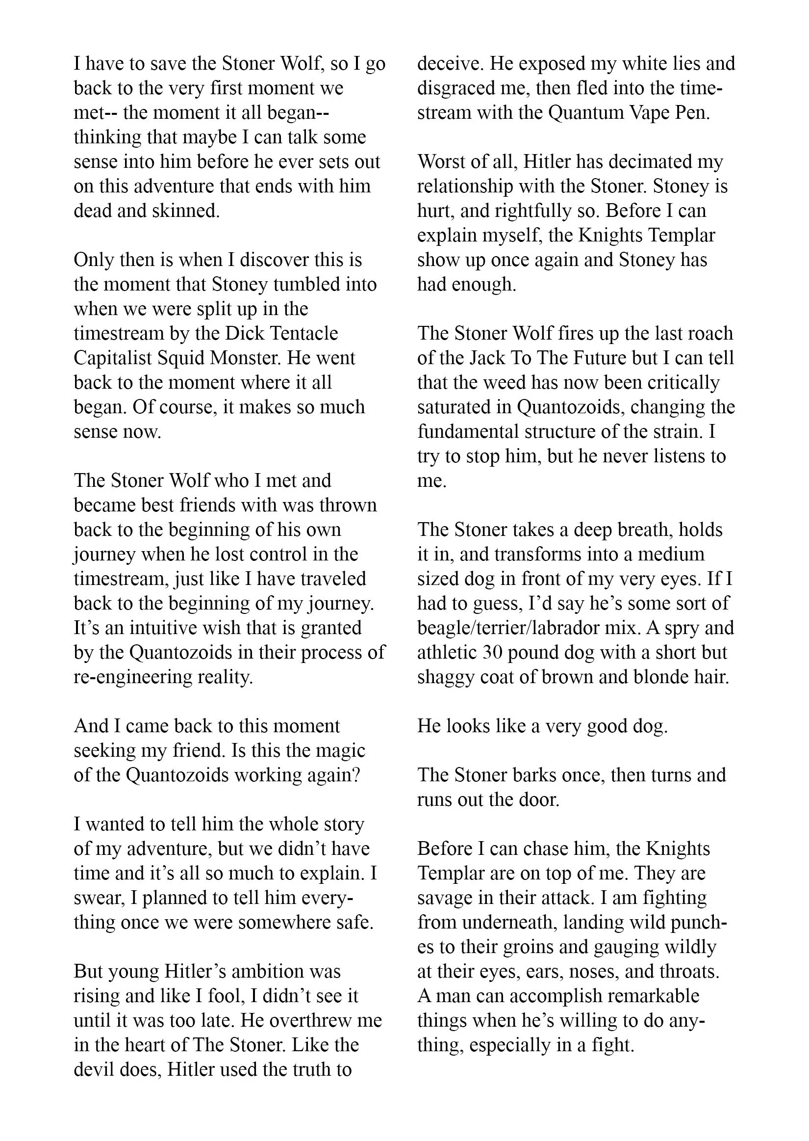 Issue 29: “The Pilgrims”. The Stoner is a few years removed from a traumatic brain injury that changed his life and his perception of reality. He’s still not sure if Fred the Fed and all the werewolf stuff was real. He meets up with his ex girlfriend in Europe in the dead of winter to work through some shit, but he never brings up the story of The Stoner. Just references that he was having a hard time making sense of reality for awhile. Maybe it will all appear in a hallucination while he’s on psychedelics.