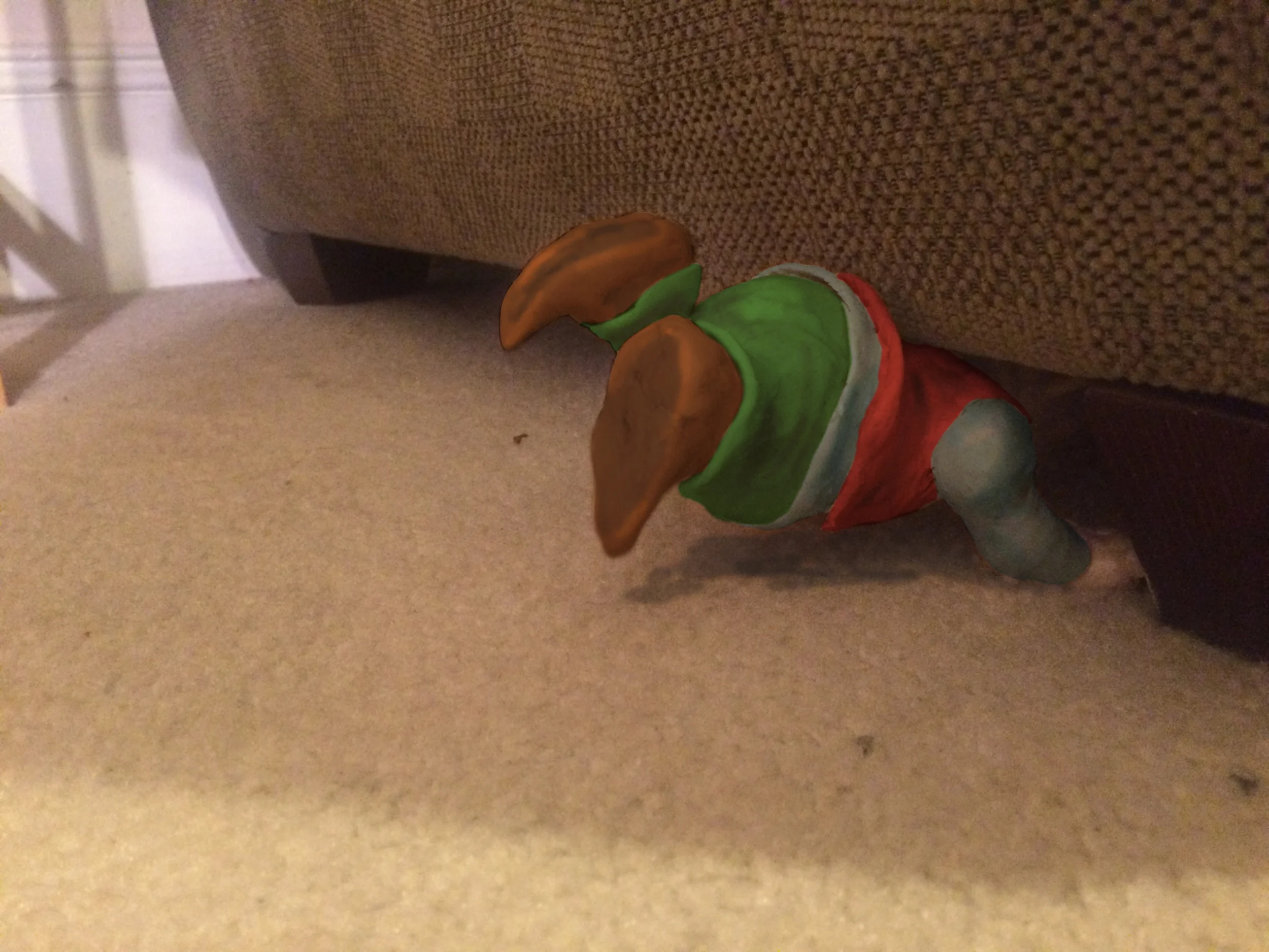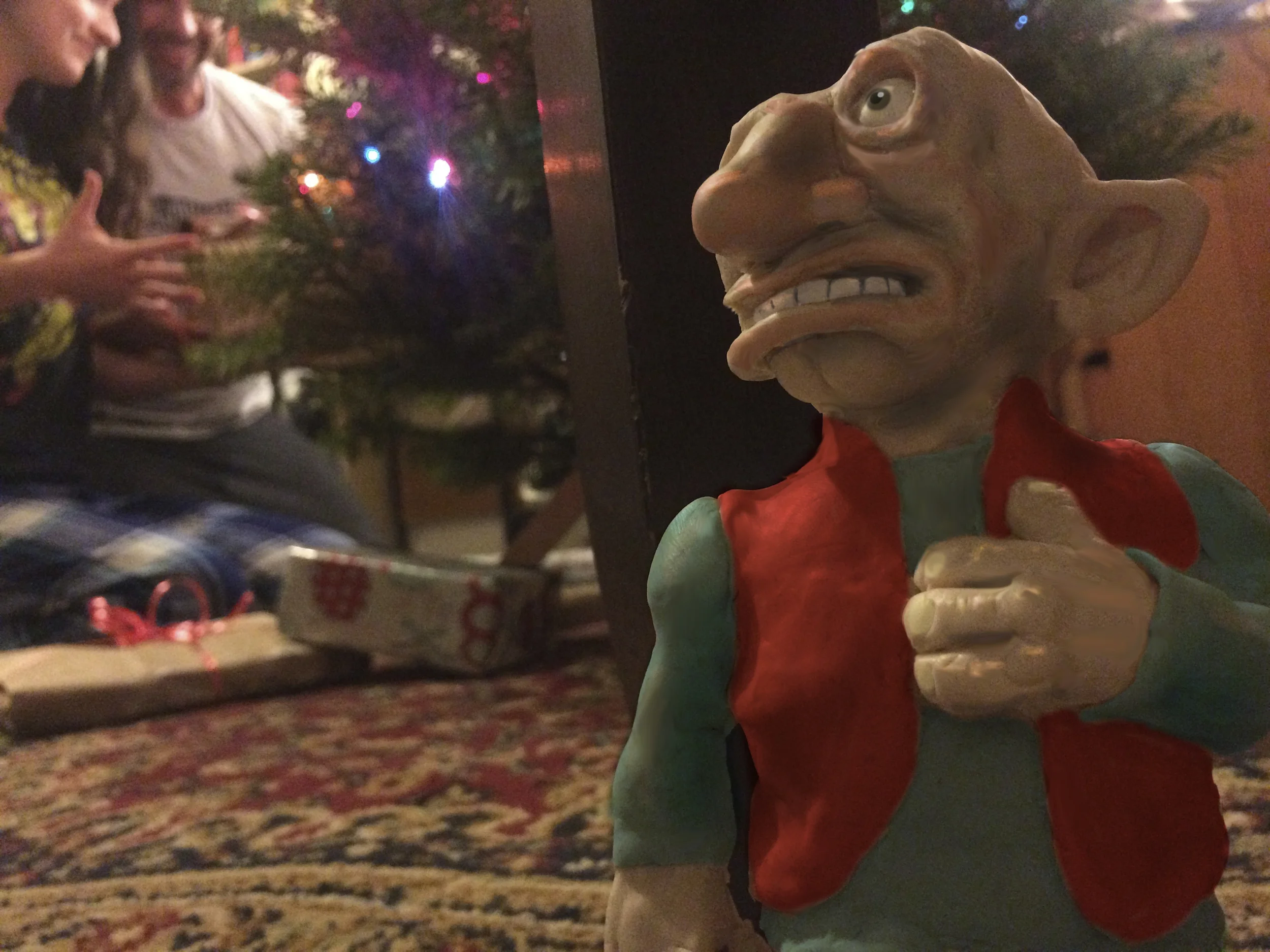 “It’s Christmas morning” He whispered to himself and he whipped his head toward the door. He searched for cover through one bloodshot eye. “its Christmas morning”, he repeated to himself. He dashed behind the leg of a writing desk and sucked his gut in to fit unnoticed.