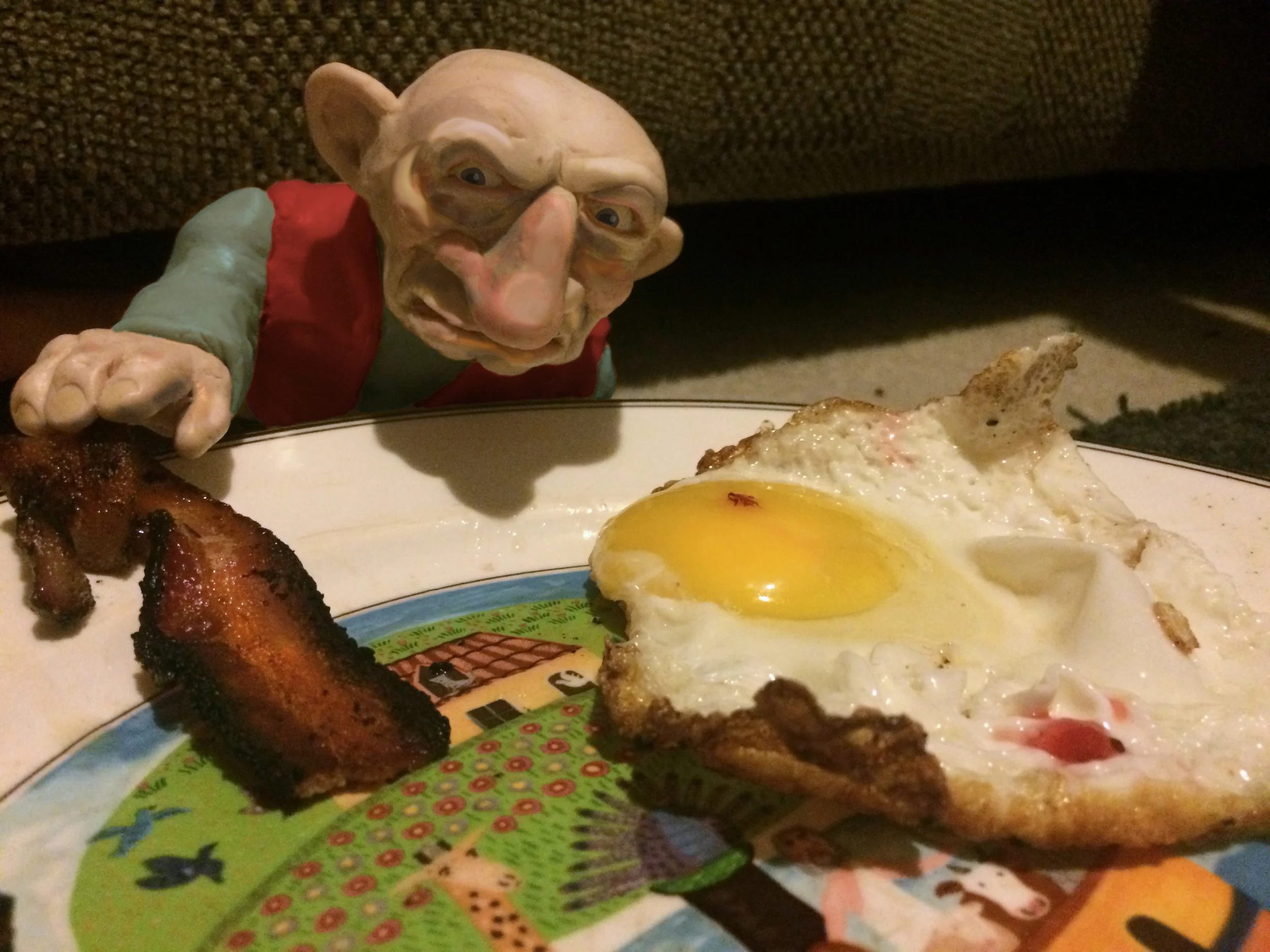 Igor stretched one stubby arm beyond his reach, snatched the bacon, and slithered back into hiding. He savagely chomped it down. “One down. 3 to go”, Igor said, and was interrupted by a deep gurgle in his stomach.