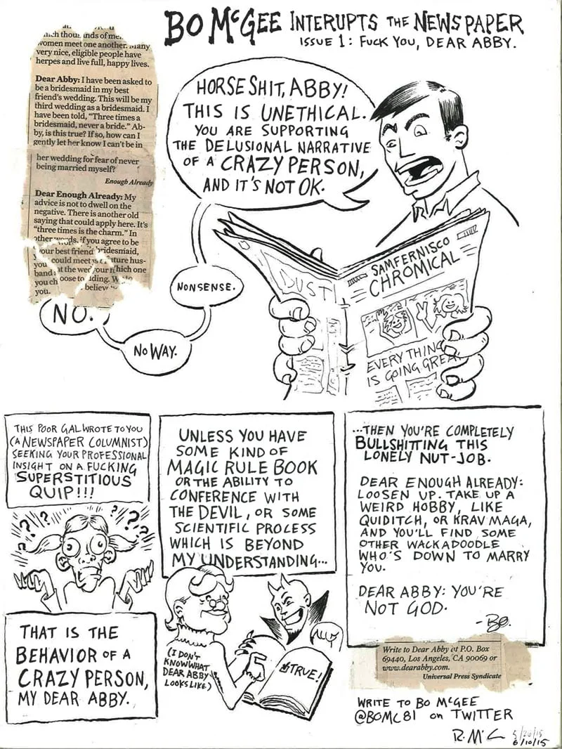 When I came upon this "Dear Abby" column, it reminded me of an idea for a webcomic that I never quite got out of the incubator. So I tore out the column, taped it in the upper left hand corner of the page, and started with the word "NO". Then I just sort of intuitively let everything that I wanted to say fall in to place on the page, and I am really happy with how it came out.