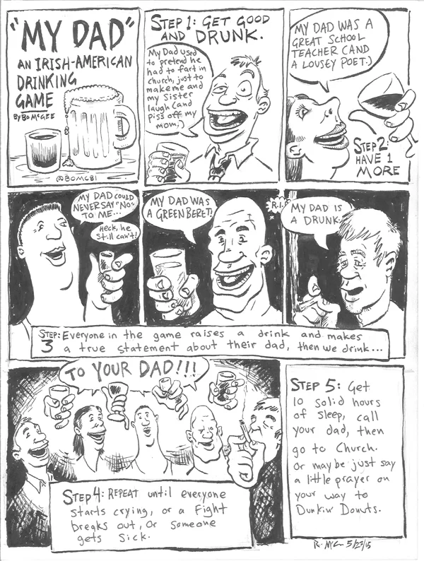 /"My Dad" was more or less written before I started the #IllustrationADay challenge. It's a drinking game I've been playing for years, and I'd often thought about illustrating it. While I was working on "Fuck You, Dear Abby", it dawned on me that now is the time to bring this idea to fruition. I got so excited to draw it that I had to summon great restraint and force myself to wait until the next morning before starting in on it, in order to honor the integrity of the challenge.