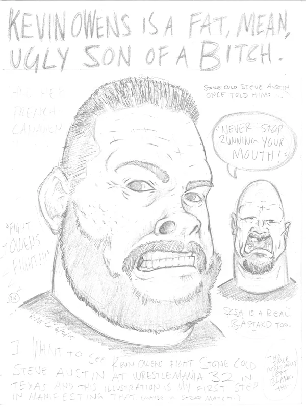 I want to see Kevin Owens fight Stone Cold Steve Austin at Wrestlemania 32 in Texas and this illustration is my first step in manifesting that.