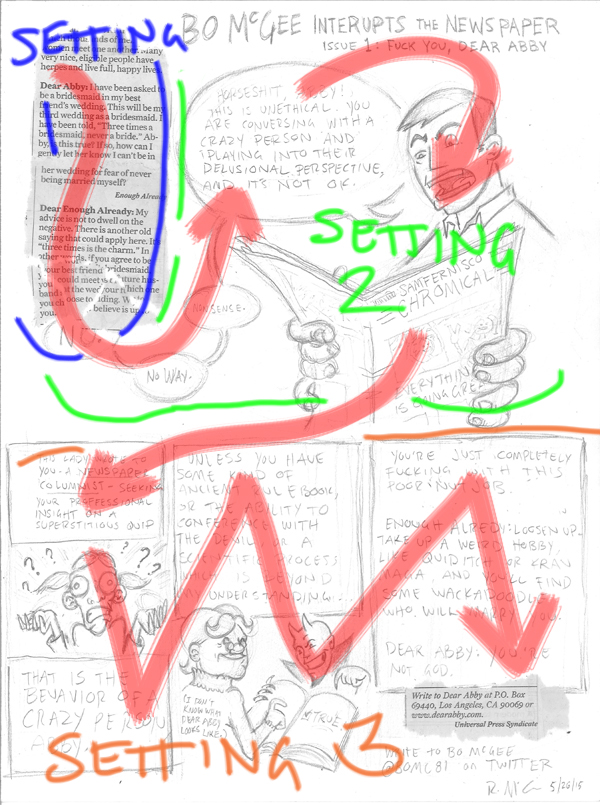 I executed this as directly as possible; by leaning on a traditional eye line which gives each setting it's own unique readership experience. We start with standard downward scanning in the top left corner, then a big upward swoop into Bo's world, then the eye line shoots you down into the narrator's mind.