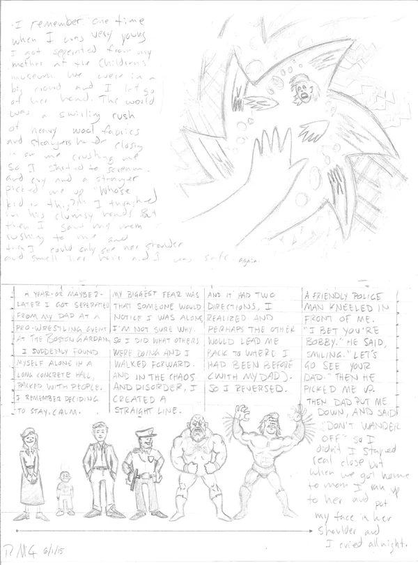 A year- or maybe 2- later I got seperated from my dad at a pro-wrestling event at the Boston Gardan. I suddenly found myself alone in a long concrete hall, packed with people.