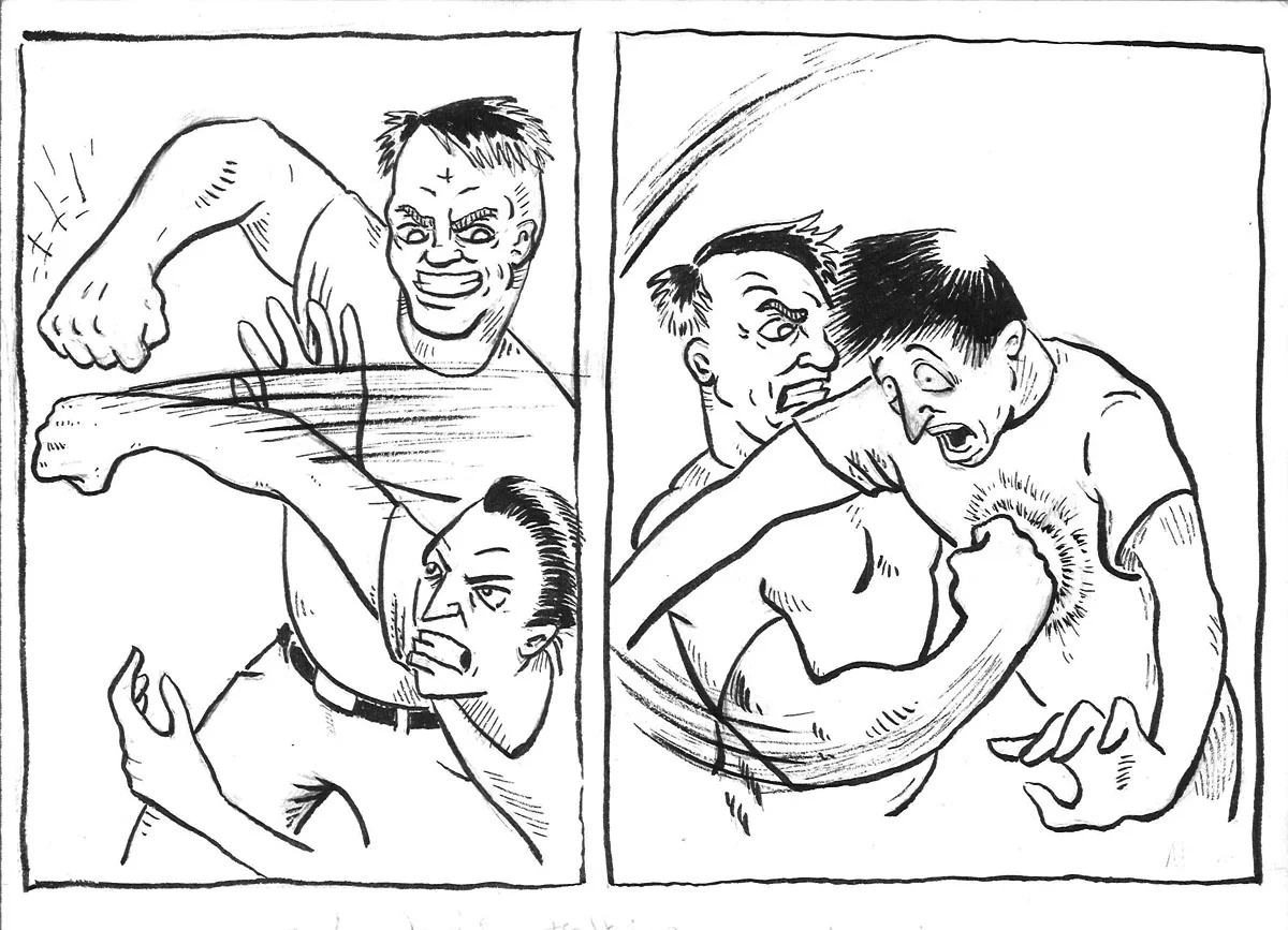 /On day six of the #IllustrationADay challenge, Vinnie threw a wild punch in a fitful rage. But Frank– a trained fighter with a clear physical advantage– side stepped the punch with ease and landed a swift and forceful blow squarely to Vinnie's solar plexus, immediately driving all of the righteous, vengeful passion from his body with a thump and a deathly wheeze.