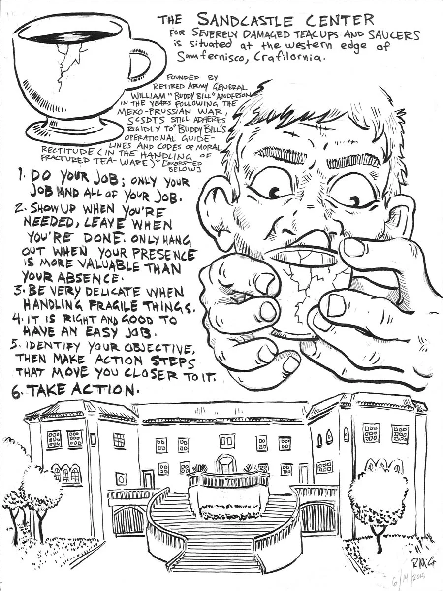 But that's not what this illustration is about. This illustration is about The SandCastle Center For Fractured Tea Cups, Saucers & China (also known as TSCCFFTCSC or "the 'Castle"). For the better part of a decade, TSCCFFTCSC was my day job. I rode the L Taraval out to the intersection of California and the Pacific and put in a day's work, patiently sifting through San Francisco's discarded dishware. For 10 years I would glue handles back on teacups, paint over chips in saucers, and unbend tiny spoons.