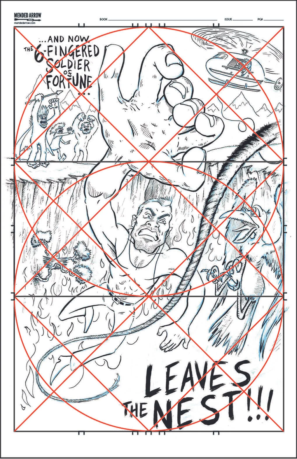 The blog even offers an easily downloaded template for the grid, so I just printed that and used my trusty lightbox to compose the image over it. I tried to line up the eye line and the action lines with the grid. I knew that I wanted to put this big, six-fingered hand in the foreground and then cram as much story and action into the piece as possible. I'm pretty happy with how it's turned out so far.